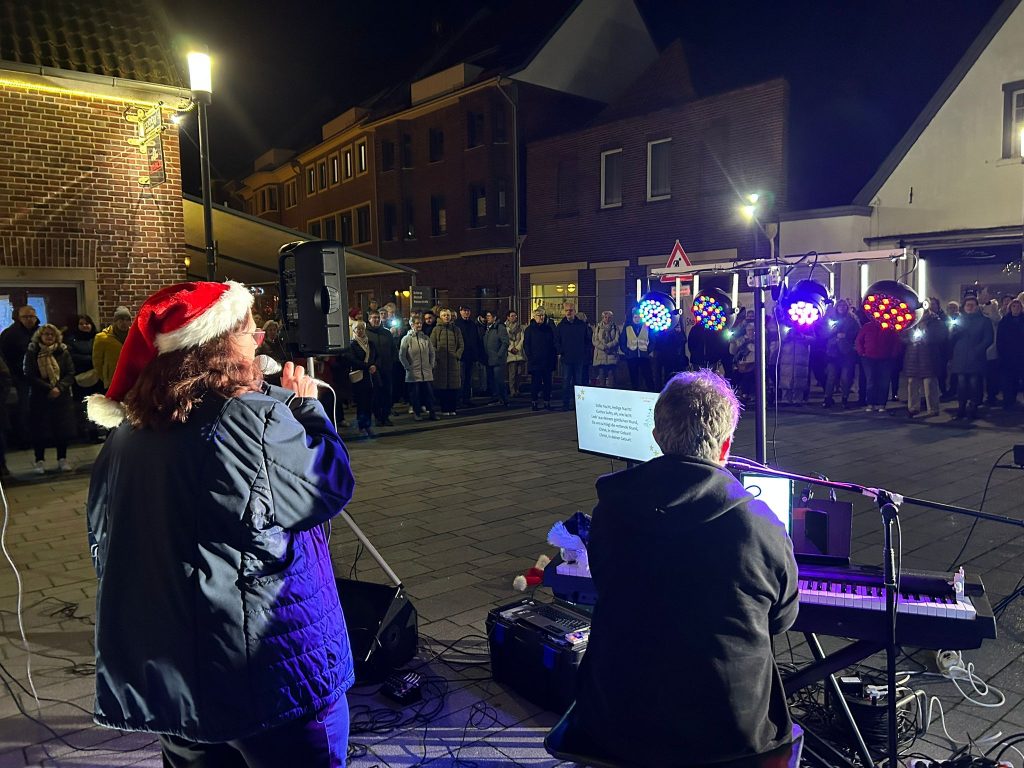 Weihnachtsstimmung pur: Auf dem Kirchplatz in Ochtrup kamen zahlreiche Menschen zusammen, um gemeinsam Weihnachtslieder zu singen. Begleitet von Chorleiter Andreas Pauk am Klavier und Sängerinnen des Pop-Chors Allegro wurde der Abend zu einem besonderen Erlebnis.