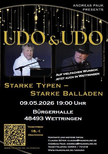 Kommen Sie mit auf eine musikalische Reise durch Jahrzehnte deutscher Musikgeschichte und feiern Sie die Lieder, die Generationen geprägt haben! Udo & Udo – das Konzert, das die Herzen höherschlagen lässt.